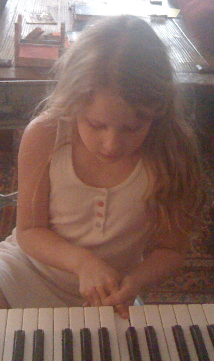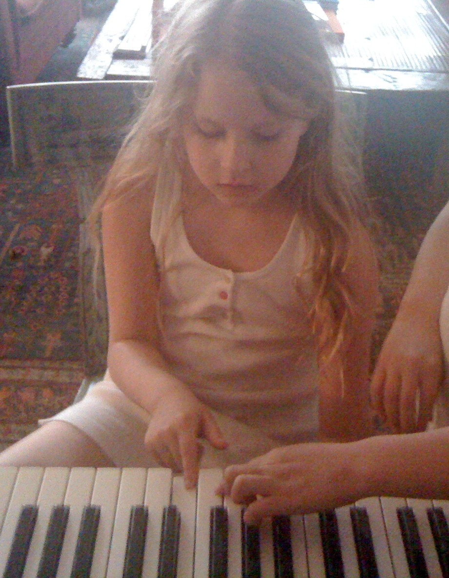 A few weeks ago Nic was playing “Hey Jude” on the piano. “Hey Jude” happens to be one of Emma’s favorite songs, so Emma sang along as Nic played. A little later, maybe the fifth or sixth time Nic ran through the first verse, Emma wandered over and stood beside him at the keyboard. Every now and then she would play a note and look at him. Within a few minutes she was seated at the piano and Nic was teaching her the notes. (That’s Nic’s hand on the right side of the photo showing Emma which note to play.)