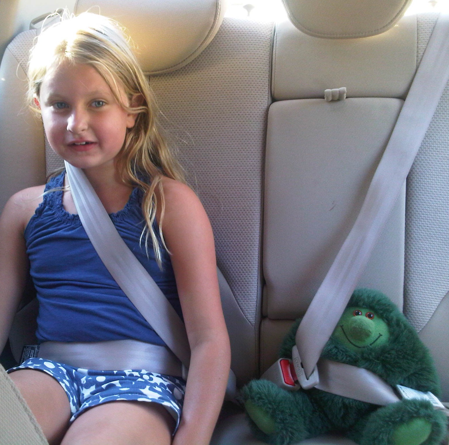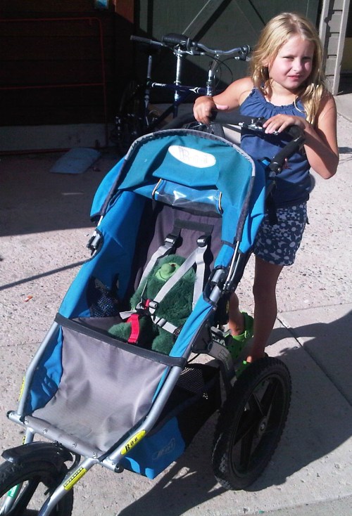Later in the afternoon, Joe took her out to play. She insisted on bringing her stuffed animal Muzzy along. See the attached photos Joe took after Emma buckled Muzzy’s seat belt in the car and then strapped him into a jogger, pushing him down one of the local bike paths. This new affectionate attachment to her stuffed monster-animal pal is another very encouraging sign. Muzzy recently accompanied her in a hospital bed, and now that he seems to have fully recuperated, she’s taken him for an outing in the countryside.