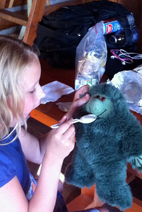 Then when none of us responded immediately she said, “Muzzy have snack?”  It was her killer instincts at work, going straight for the jugular.  What parent in their right mind could veto that?   Particularly as this was displaying everything we have dreamed of, attachment to a toy, pretend play…