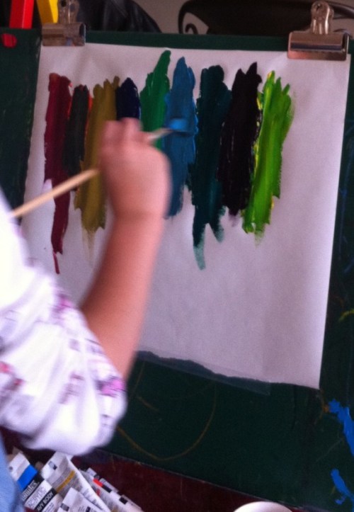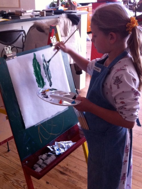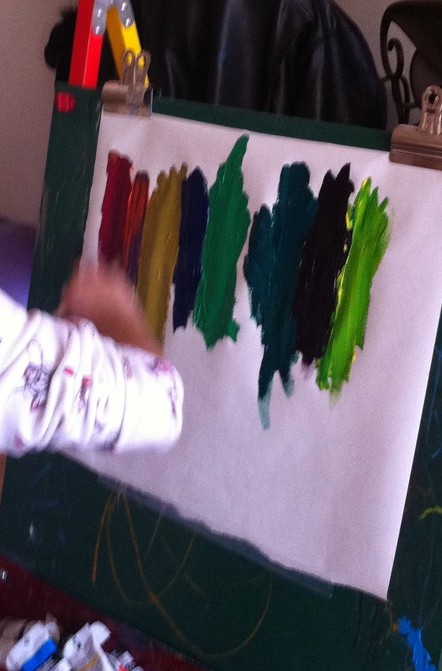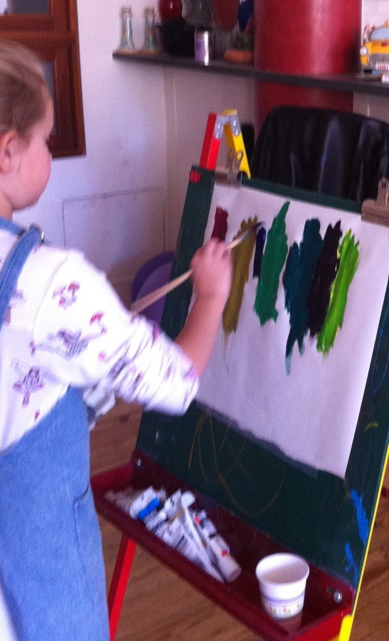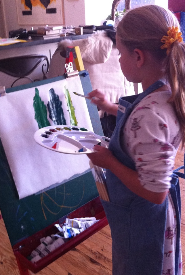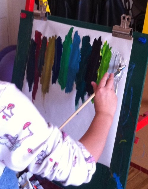 So we set up the easel with new paper and unwrapped all the brushes and paints. Emma stood nearby and watched.