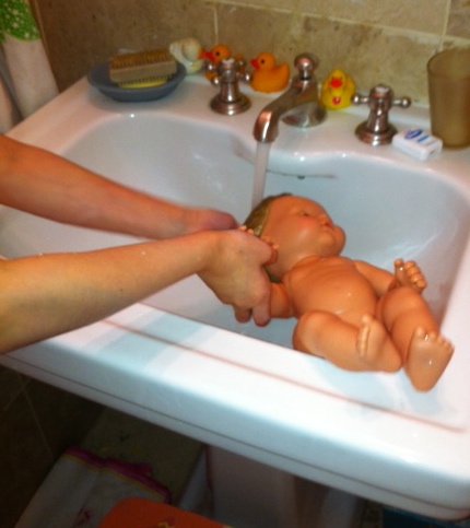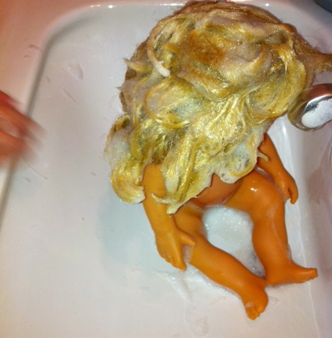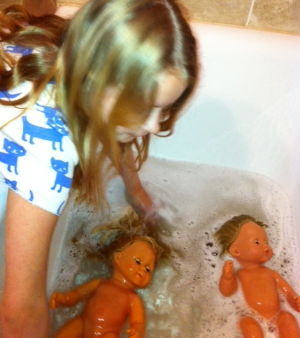 As Nic said this, Emma squirted an enormous amount of shampoo onto each of her doll’s heads.