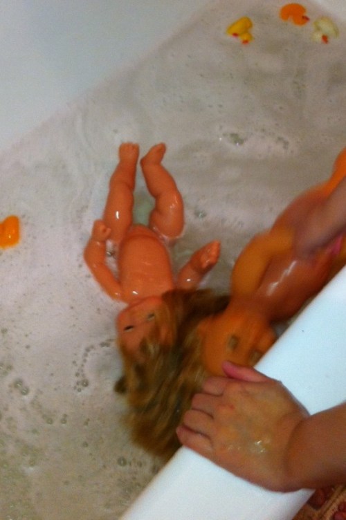 I often find myself looking for little clues, the small details in what Emma does as reasons for hope. The washing of her dolls is such a great example, I think, of Emma’s continued development. That she thought to include the rubber ducks was such a wonderful display of thoughtfulness and pretend play. Emma still doesn’t cuddle her dolls the way I used to when I was a little girl, but in her own way she is caring for them, giving them a bath, washing their hair, rinsing them off and then drying them, wrapping them in towels before leaving them on the floor. She has, in the past, put them in bed as well, though she seemed to lose interest before that thought occurred to her.