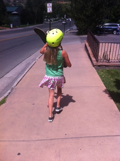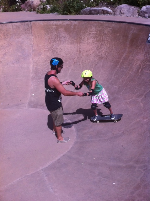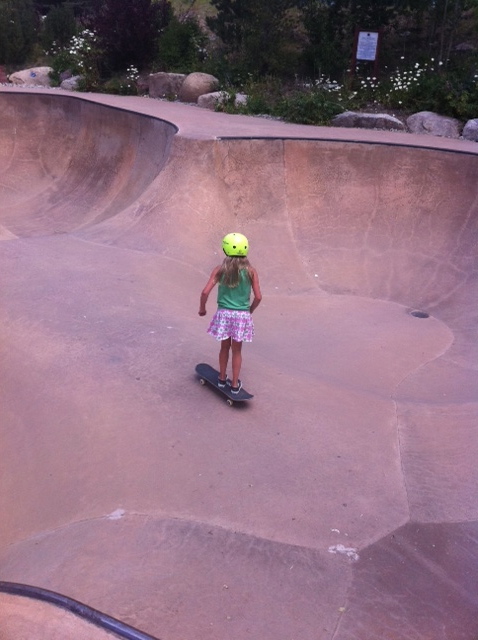 We spoke to one of the instructors from Nic’s skateboard camp and arranged a lesson for Emma that afternoon. When we finally went to meet him, we realized we hadn’t brought sneakers for her to wear and so bought a new pair at the skateboard shop. They didn’t have any socks small enough for her, so she just wore the shoes without socks, despite my fleeting concern that she would get blisters. With borrowed skateboard in hand, we headed to the skateboard park, Emma leading the way.