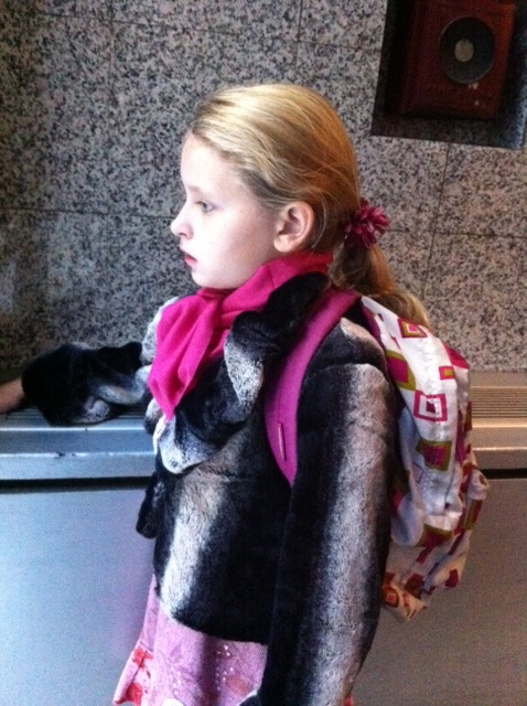 Emma waiting for her bus this morning wearing a “pretty dress”.