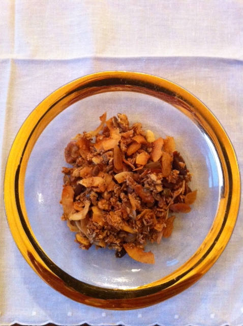 1 Cup Organic Oats, ½ C. unsweetened shredded coconut, ½ C. unsweetened coconut flakes or chips, ½ C. pumpkin seeds, ½ C. sunflower seeds, ½ C. chopped walnuts, ½ C. pecans (or sliced almonds)