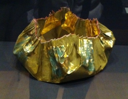 I cannot describe how incredible it is to have the comfort of our home with only Richard and me (and our cat, Merlin) here in it.  For one thing it is very, very quiet.    And for another we can come and go as we please without booking caregivers, worrying about being home at specific hours; it’s hard to believe a large portion of the population lives this way on a daily basis.  I can’t imagine!  So yesterday Richard and I went up to MAD (Museum of Art and Design) leisurely strolled through the exhibits, even wandered up to the sixth floor to the Open Studios, where we met the artist, Fergus Walsh, a puppeteer at work on one of his wonderfully expressive clay looking creatures with funny eye balls.  Then we made our way downstairs to the Beauty in All Things:  Japanese in Art and Design show, where I saw this Bronze Vessel by Iwata Kiyomi, made of metal cloth, composite, gold leaf, silk organza and acrylic paint.