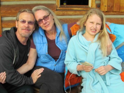 Despite the fact it was broad daylight and there were lots of weird insects flying around, many of them inside the cabin.  Nic took enormous pleasure in shooshing all the bugs and moths outside, while Emma, Richard and I sat together in the rocking chairs.  Point a camera toward Emma and she makes her “say cheese” face.