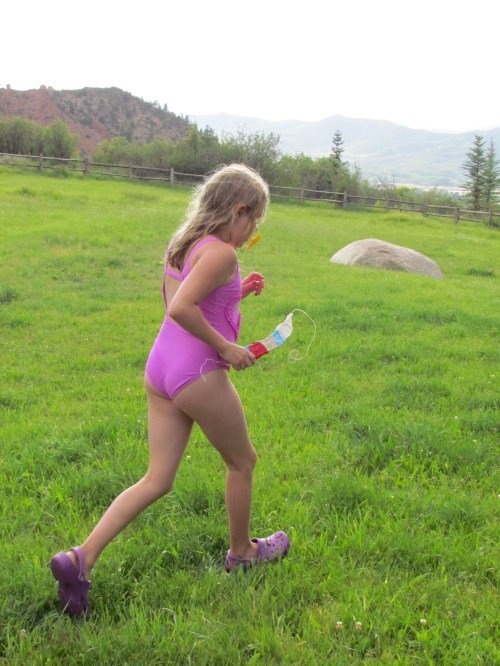 When we got home, Emma donned her pink bathing suit, which also happened to match her pink fingernails, and ran through the sprinklers until it was time for dinner. (Notice Emma’s string, which has resurfaced and she has added to in the past month.)