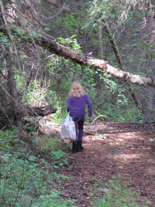 Richard, not one to be easily deterred, proceeded to put the 4-wheeler in reverse in an attempt to go around the tree branch, and in doing so went up a steep incline and over a large boulder, while almost flipping it.  After much excitement (aka me yelling in a hysterical voice, “you’re going to flip it!” causing Richard to say, as one wheel hovered a full foot off the ground, “you know, you’re not exactly helping.”  Eventually he brought the 4-wheeler to a stop with all four wheels planted firmly on the ground (much to my relief) and we abandoned it.  “Well you get the best of both worlds,” Richard remarked, as we hoisted our backpacks and bags (some filled with Emma’s books) on our backs.  “Now you get to walk.”