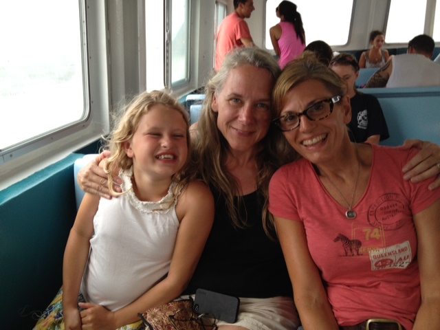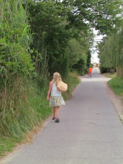 Emma insisted we bring ten of her books, which I tried really hard to talk her out of, but that she finally convinced me she couldn’t be without.  We had more books and technological devices with us than clothing.  Never mind, I thought to myself, it’s hot, we’ll be living in our bathing suits.  And then Bobbie was outside and we ran downstairs, piled into her car and headed off on our little adventure.   By the time we arrived in Fire Island it was afternoon.  There are no roads so all the homes come with bicycles.  You drag your things from the ferry in a little cart, which you then unload and leave the cart and bikes outside your house.  Inside children ranging in age from 4 to 14 raced around and adults ranging in age from their late 30’s to late 60’s chatted.  Emma was in her element.  She loves nothing more than a house bustling with people and lots of noise.