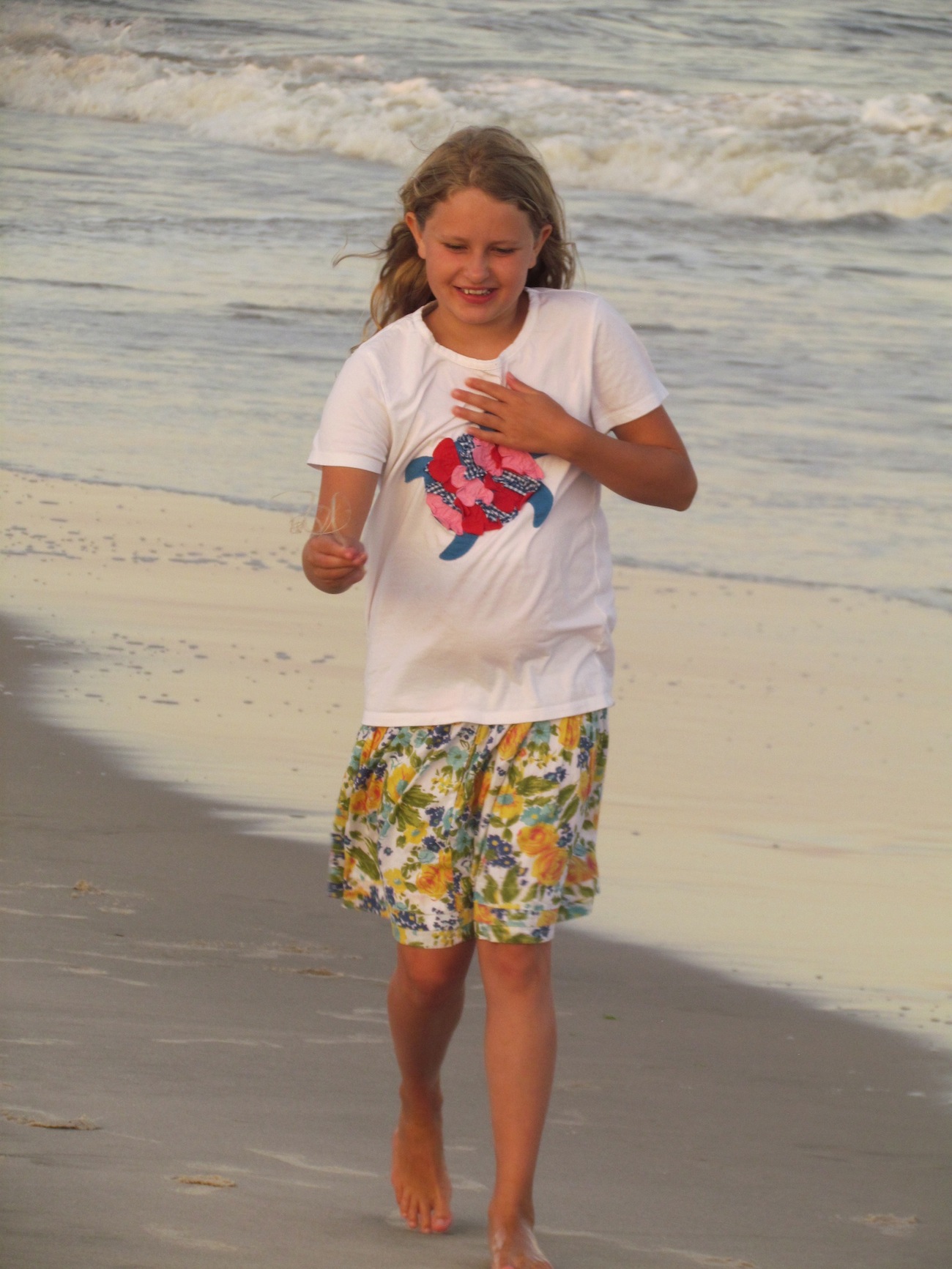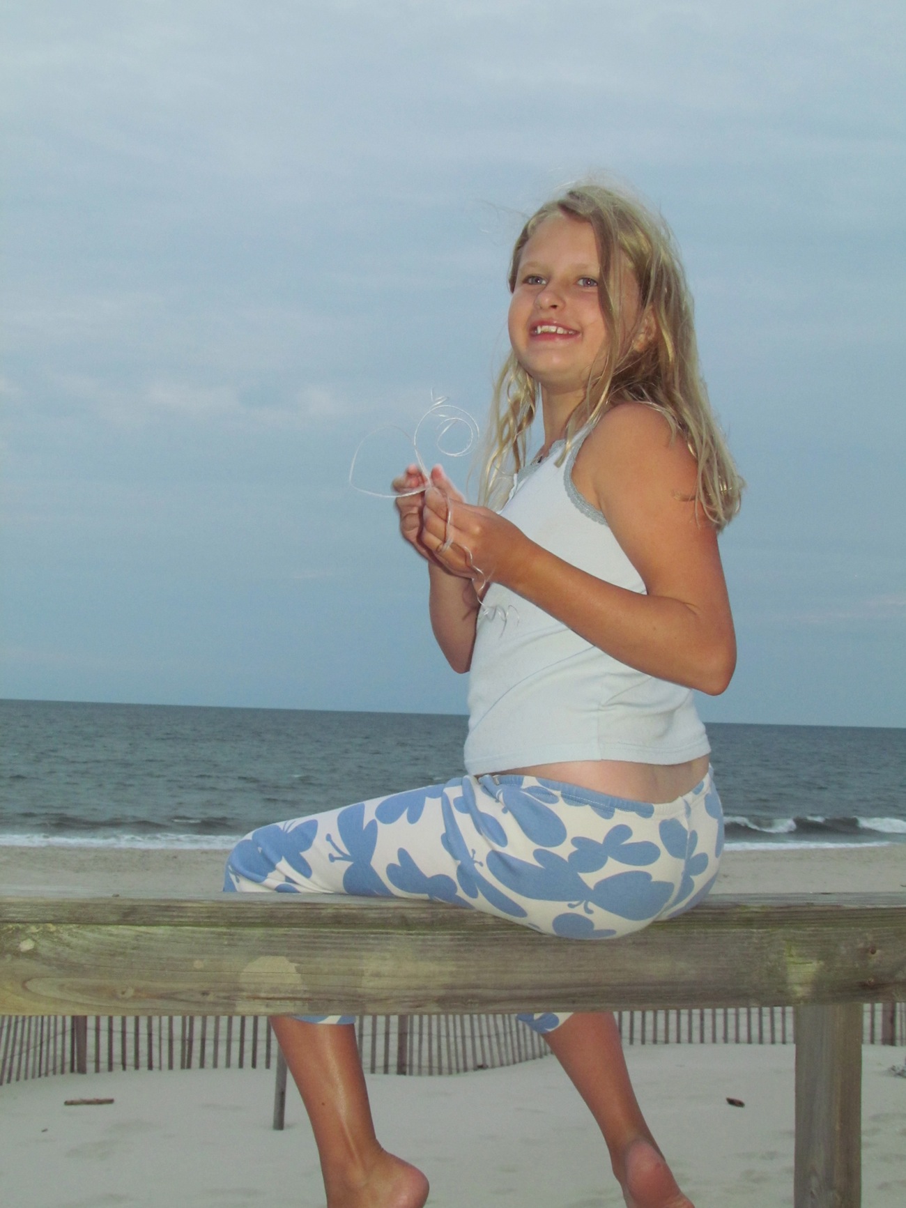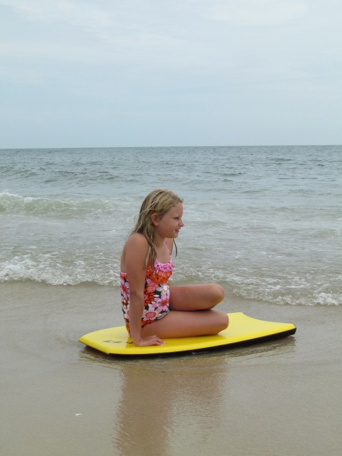 The ocean beckoned, but Emma caught sight of a swimming pool on someone’s deck, “Go swimming in the pool?” she asked pointing to the neighboring house.  I explained that this wouldn’t be possible, though I could tell Emma remained unconvinced and when Bobbie told us there was an Inn just a few houses away with a big swimming pool, it was decided.  Off we went with Bobbie’s daughter Mina, who is exactly the same age as Em.  We  jumped and splashed and played “chicken” where the girls sat on our shoulders while they tried to push each other off.  There was lots of laughter and squealing with excitement and delight and I had a moment when I realized I was laughing and Emma was laughing and Mina was laughing and Bobbie was laughing.  I stared up at the sky in that moment, atheist that I am, and said a silent thank you.  It was heartfelt and honest.  I was relieved.  So incredibly relieved.