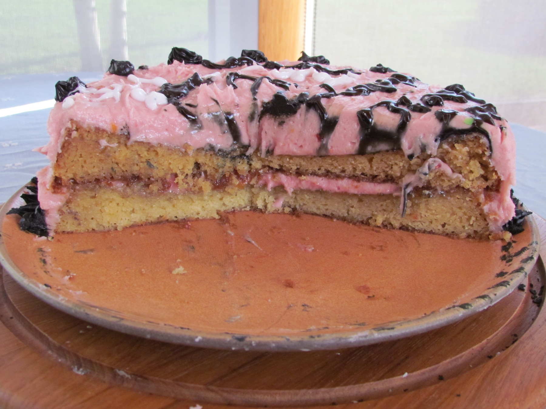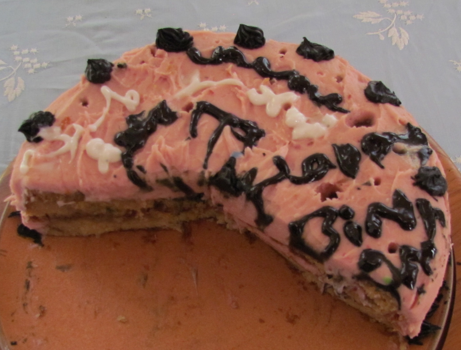 The vanilla cake with raspberry icing Em and I made.  Nic and Emma decorated it by writing everyone’s name on it.  And yes, it was delicious!