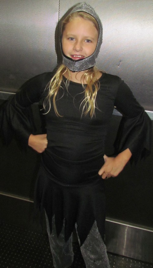 By the time they returned home I was able to hobble up to the roof with Em where she insisted on wearing this outfit.  It’s a new take on the standard knight costume, a kind of King Arthur’s knight meets one of the witches from Macbeth.  Personally I think it totally works and can we all take a moment and admire Emma’s pose.  (No.  I did not set this up.  She saw the camera and struck a pose unprompted..)
