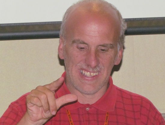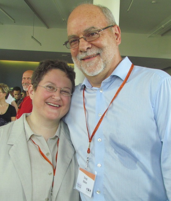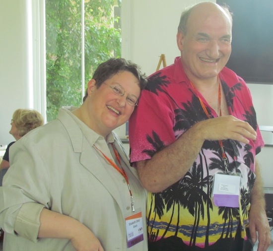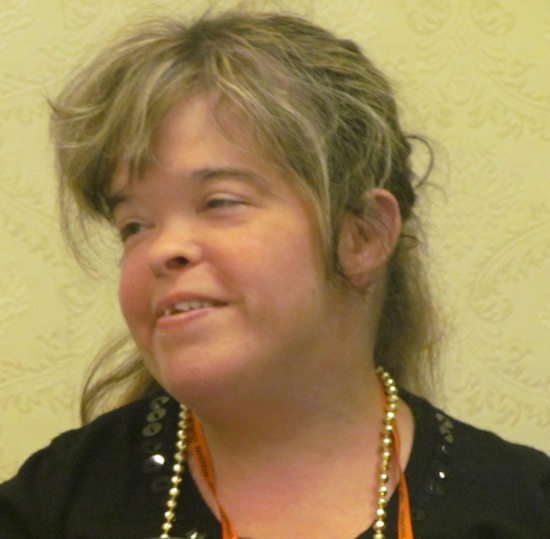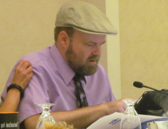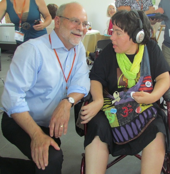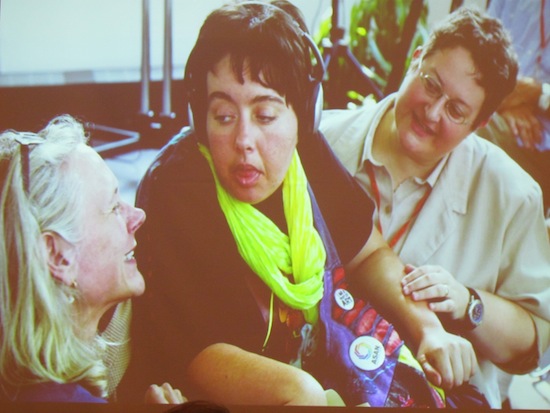 I become hyper aware of the injustices of the world, I feel both ecstatic to be among so many wonderfully accepting people, while also horrified by the “real” world we live in and must soon return to. The disconnect starts to feel impossible. I begin to believe the change so many are trying to create will never come about. I slide helplessly into despair. And then I bolster myself up by remembering other people’s words. At yesterday’s keynote address with Jamie Burke, Sue Rubin, Tracy Thresher and Larry Bissonnette, Tracy typed, “Larry likes typing out poking fingers on hurtful labeling to push his wrecking ball toward brick walls of structures of old thinking. What I intend is to push my own ball of fiery passion of change to the global stage and shatter the glass like Pascal did in the city. Pascal clumsily broke the water glass; Tracy intends to go about the Inclusion Movement more like George Clooney. Charming Tracy’s plan; worldly connections repairing injustices is the wretches-in-arms plan.”