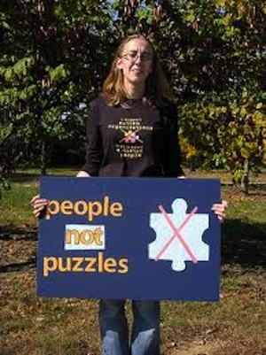Image of Melanie Yergeau with a sign of a red X over a puzzle piece.  To the left of the image are the words “people not puzzles”