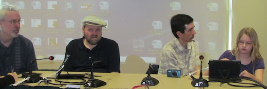 A conversation between Tracy, Henry and Emma about getting on board the “inclusion typing train” the night before the Wretches and Jabberers screening. Tracy is to Henry’s right and out of the picture frame.