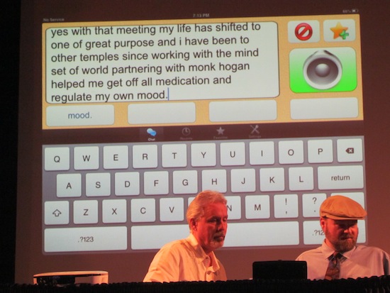 Tracy types in answer to a question from the audience about the impact the documentary and meeting monk Hogan has had on his life.