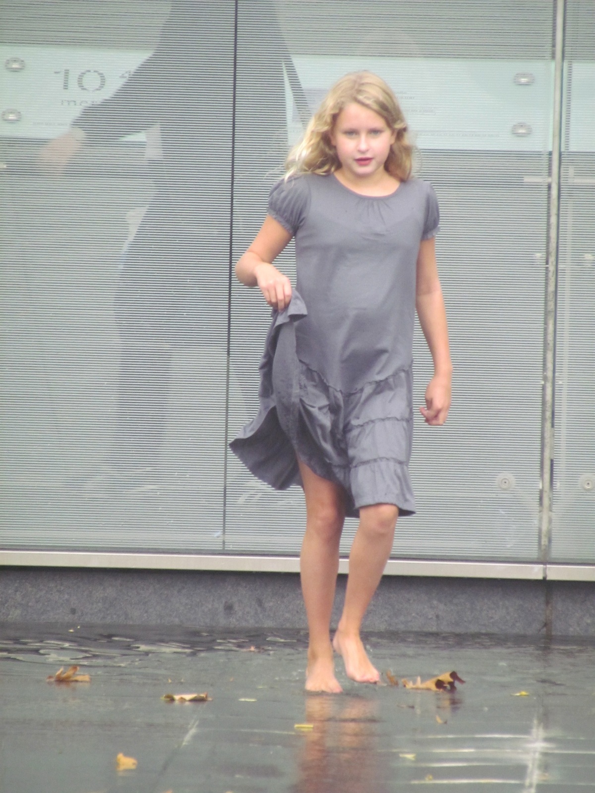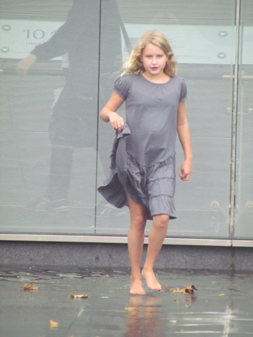 Emma running through sprinklers outside the Museum of Natural History