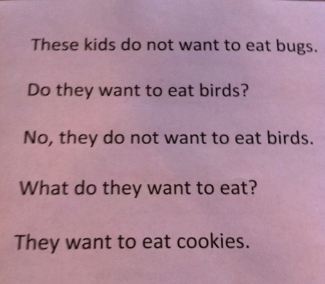 Yesterday afternoon, Emma said, “These kids do not want to eat bugs.”  Then she squinted her eyes and laughed, making her shoulders shake up and down.  It was a creative version of some of the work we’ve been doing during her literacy program.  We’ve been working on sentences such as – These are kids, they want to rest.  They are resting.  Or  This is a plane.  It can fly, but someone has to make it fly.