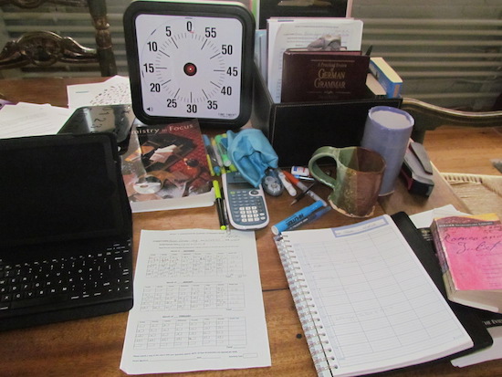 We have created a little nook devoted to various materials we use for lessons and while it’s usually in a state of complete disarray, there is some semblance of order, even if only to me and Emma.  The single most essential item other than the keyboard and stand for the iPad in the photograph below is the Timed Timer.  Without it we would be lost.  Emma explained to me that when I forget to put on the timer she is filled with rising panic and anxiety.  She told me that without a visual timer, “time can stand still, while anxiety pushes all out of its way.”  We now own three different sizes of the Timed Timer, though Emma’s preference is the largest one they have, twelve inches, for our home sessions.