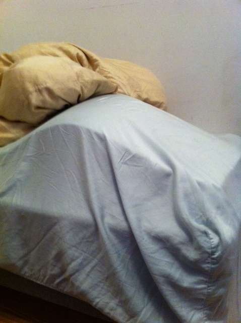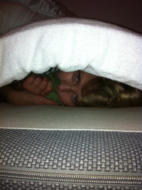 By yanking off the fitted sheet to reveal herself and yelling, “There she is!”
