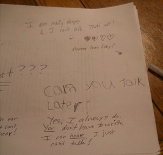 “My son is very good at talking about things he doesn’t like, but I don’t assume that he would feel entirely comfortable directly telling me things he doesn’t like about me. The things he does say indicate support rather than discomfort. A few times I have been annoyed at myself for stuttering and he says “Mommy! Don’t ever be mad at yourself for stuttering!” or, a few times, “Mommy. Stuttering. It’s a way of life.” I don’t not-communicate with him, so he does not feel ignored. I use alternative ways of communicating with him, just not talking. I write, point, use some of my extremely limited repertoire of ASL signs. I once was writing to him about what to wear to church and he wrote back “Yes, mother dearest!” He (as is true of most people I write to) matches my communication mode and writes back. I have written to him (and to others) “You don’t have to write to me; I can hear you!” He has noticed, and told me, that when he comes back from visiting his dad I “seem different.” We have talked about his coming back as a transition point- the house is suddenly noisier, and definitely “talkier.” I have often said that my child talks to think, so we are quite different in that way. I am working on what would make the transition from “kid gone” to “kid in the house” an easier one for both of us.”